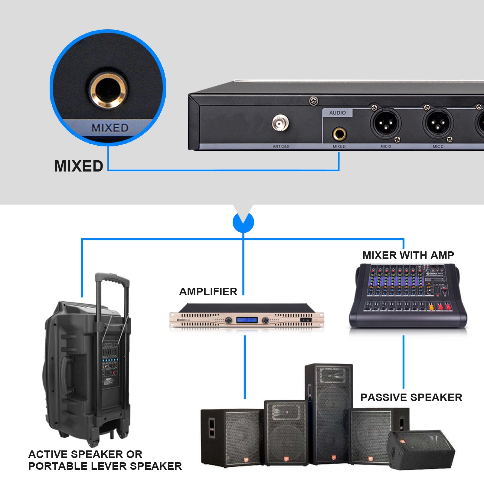 - Versatility: The all-metal receiver has independent volume control to achieve precise voice balance, and has a 6.35 mm (1/4 inch) audio output jack and 4 XLR outputs for easy installation. Suitable for all active PA speaker systems/amplifiers/mixers, etc. Standard size, the receiver is suitable for 19" standard rack.