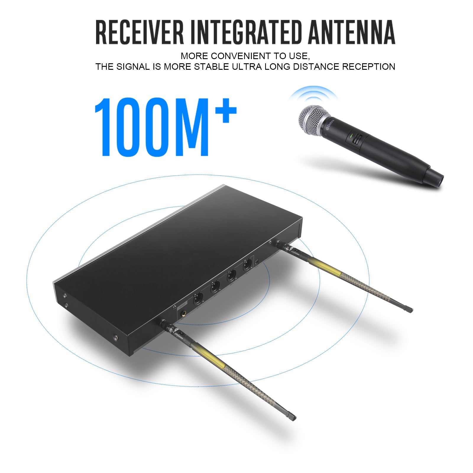 - Reliability: The 4-channel UHF wireless microphone receiver has 4 receiving antennas to improve the received signal. The high-quality test adopts anti-noise and anti-interference technology, which can remove the distortion. Sound and sound quality up to 300 feet.