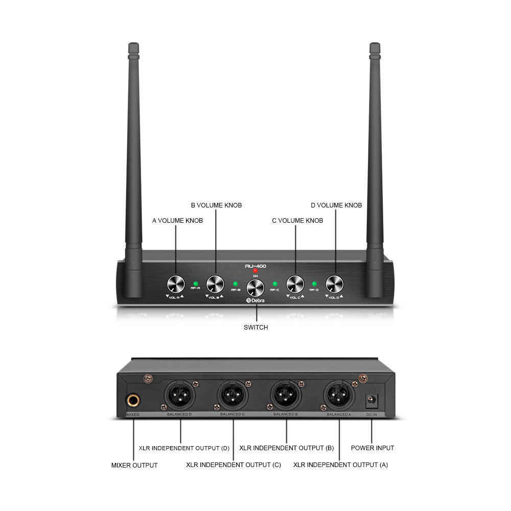 - Debra Audio AU400 4 channel wireless microphone system.(Two set freuqncy point: A- 501/511.5/524/538.5 B-506/517.5/531/546.5)