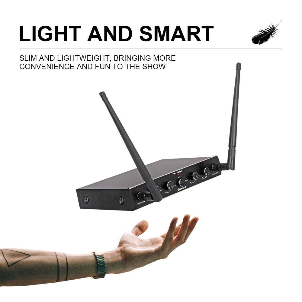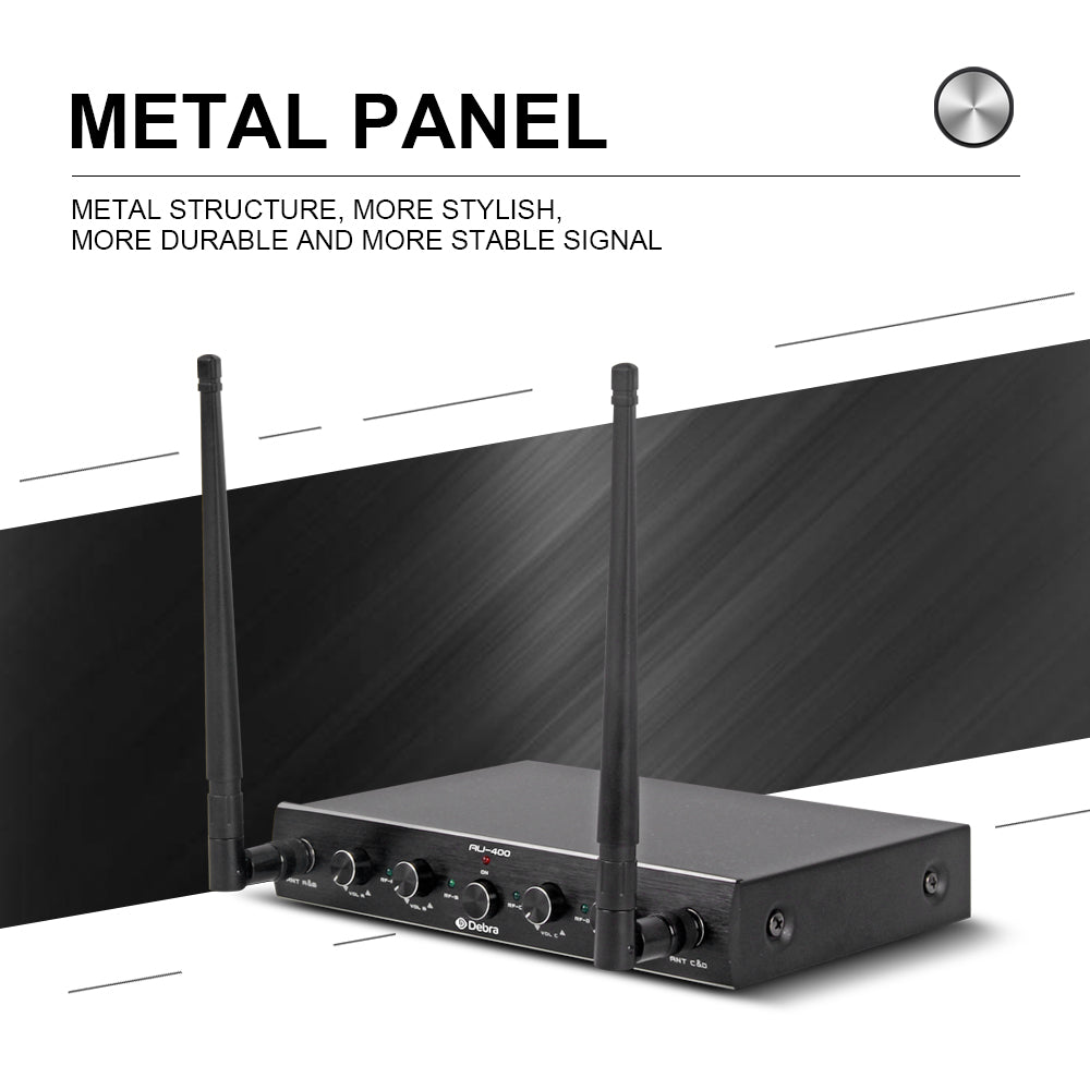 The Debra Audio AU400 system is the 4-channel UHF fixed frequency wireless microphone system that provides wide area coverage ranges with easy setup and interfere-free operation. Wireless UHF transmission enable hands-free and crisp dynamic vocal performance for conference rooms, classrooms, dance hall, KTV rooms, church, parties, and bands. Metal build VHF wireless receiver features individual adjustable channel volume controls along with audio signal indicators.