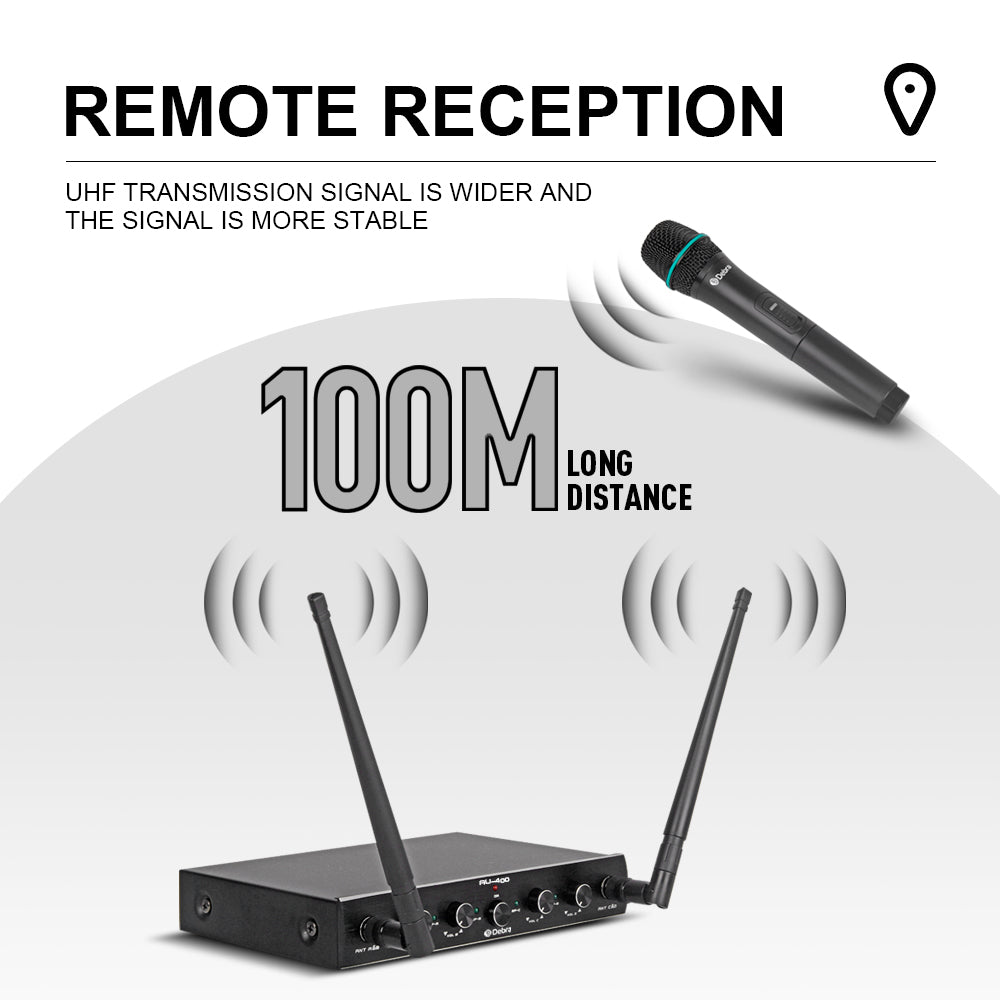 Stable fixed UHF signal ensures unsurpassed interference-free distortion-free operation, operating distance is up to about 300ft line of sight in open space. It is more good that all VHF wireless microphone system.