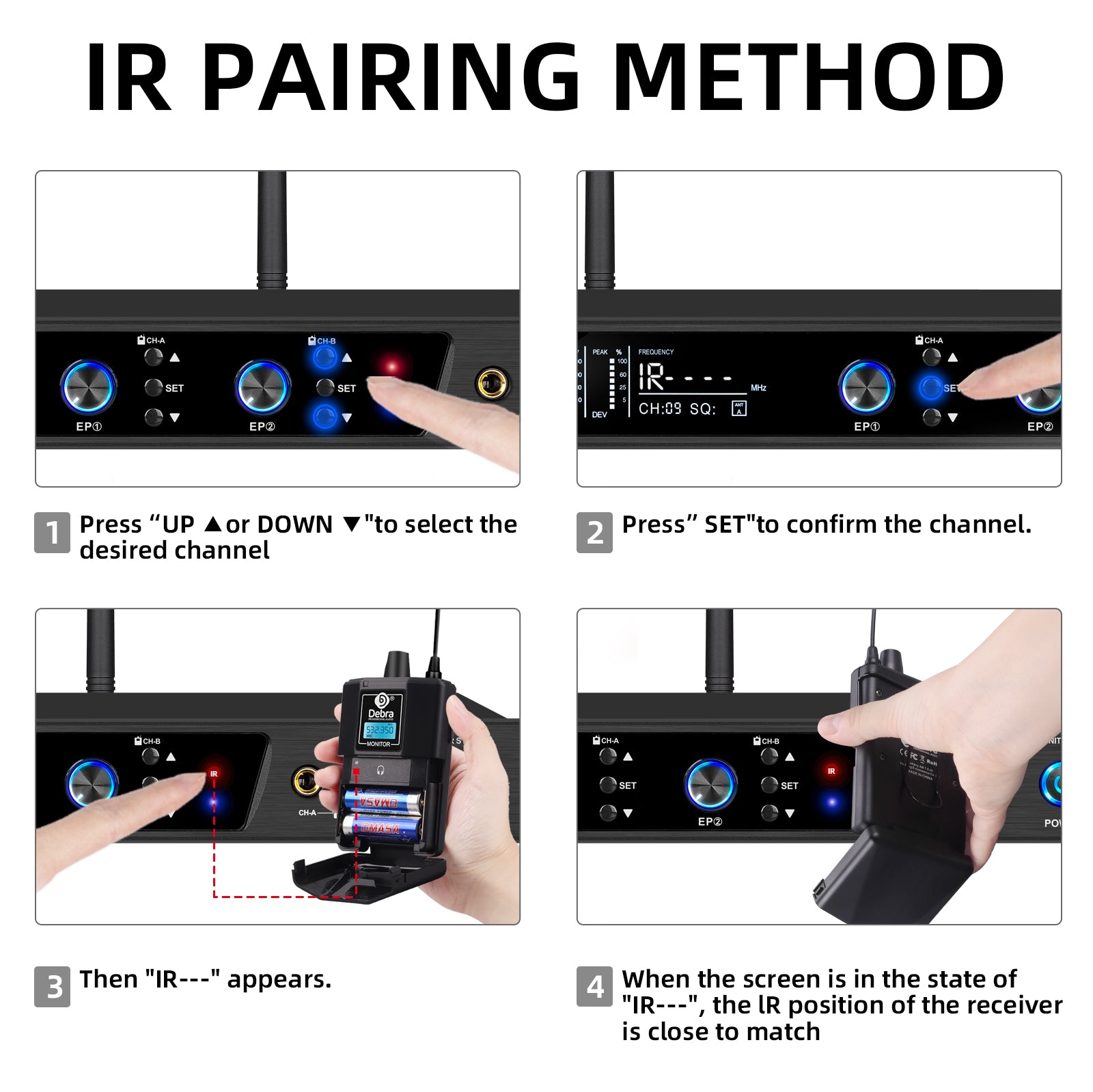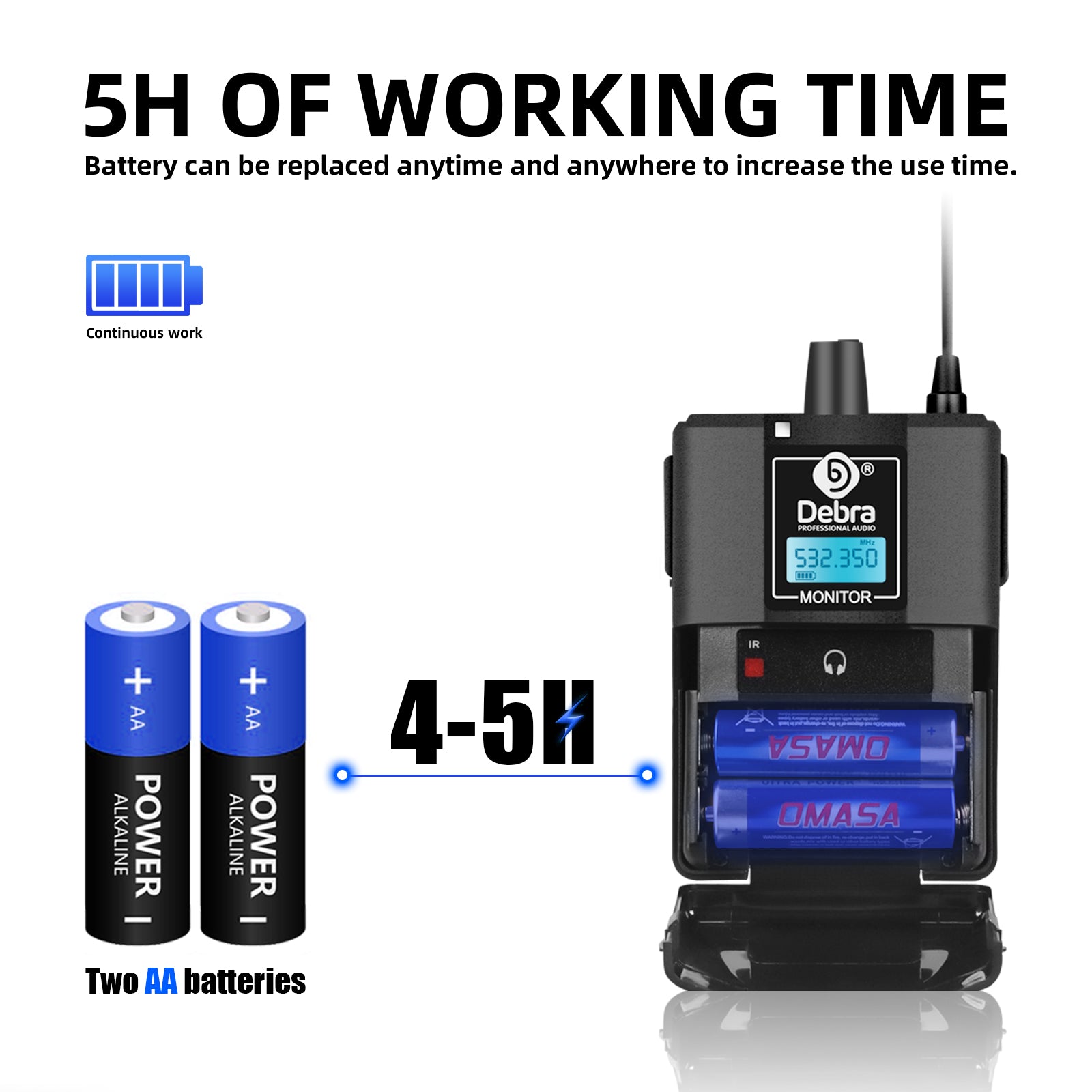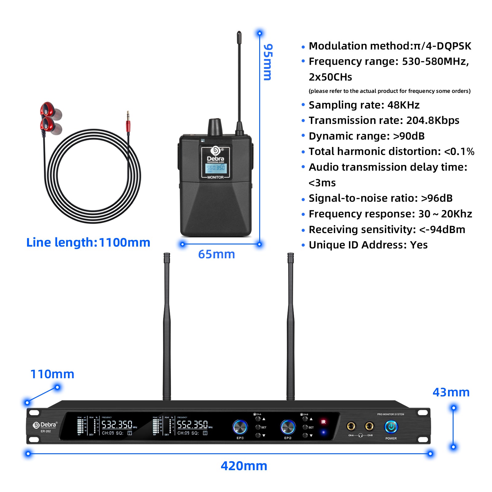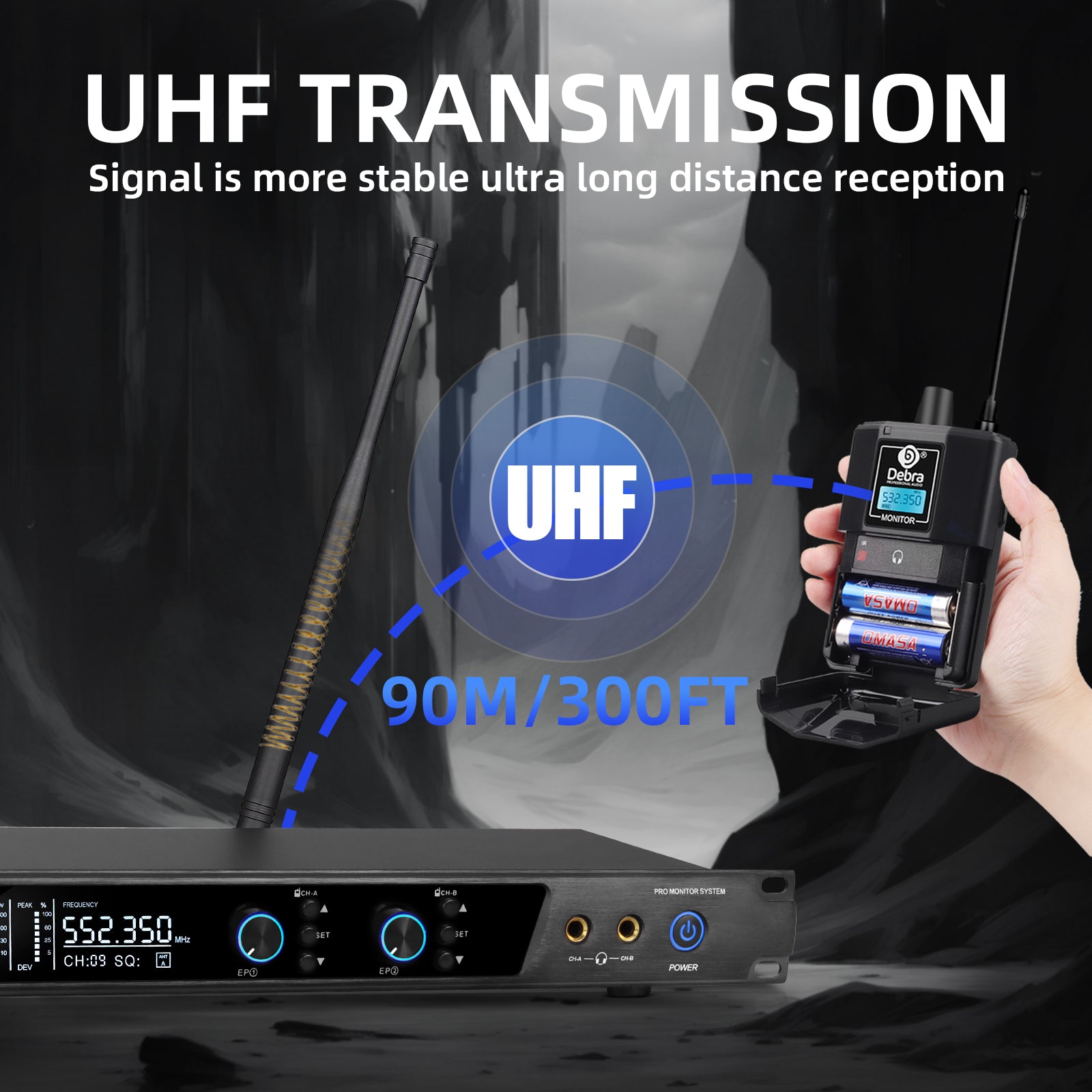 - The PRO UHF Wireless In Ear Monitoring System: D Debra audio's new UHF system with phase-locked loop PLL. It using high-quality IC chips, improves the overall performance, anti-frequency reduction, anti-series frequency, has a stronger and more stable signal, better signal to noise ratio. The frequency range is 510 MHz-580 MHz. The preset 100 frequencies for each channel can be switched at will, which can better avoid signal interference.